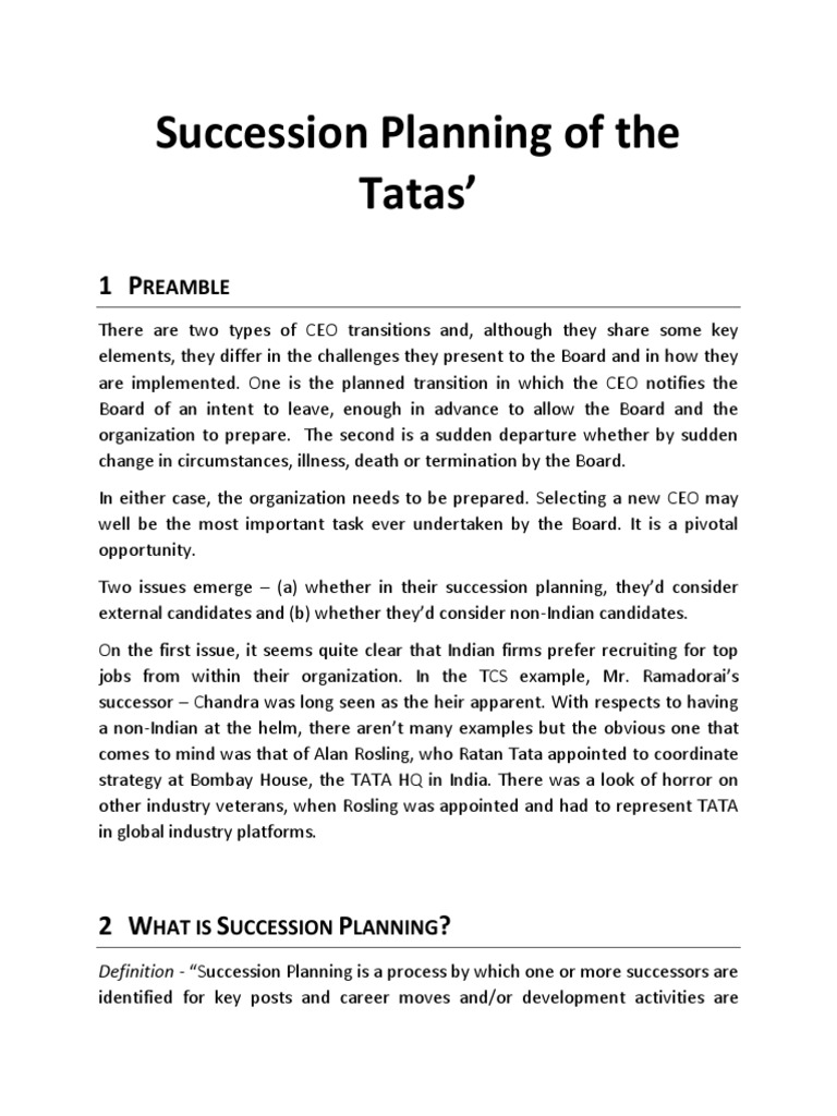 Tata Succession Planning Tata Succession Planning - Chandrasekaran's appointment as tata sons chairman following cyrus mistry's ouster a.